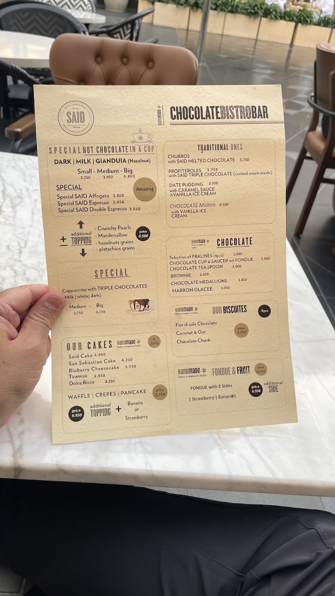 Located in The Forum, The Avenues Mall, Kuwait, SAID DAL 1923 embodies a haven for chocolate enthusiasts. Their menu is a lavish tapestry of decadent desserts, artisanal chocolates, and refined beverages. Each dish is crafted with high-quality ingredients that showcase the richness of chocolate.